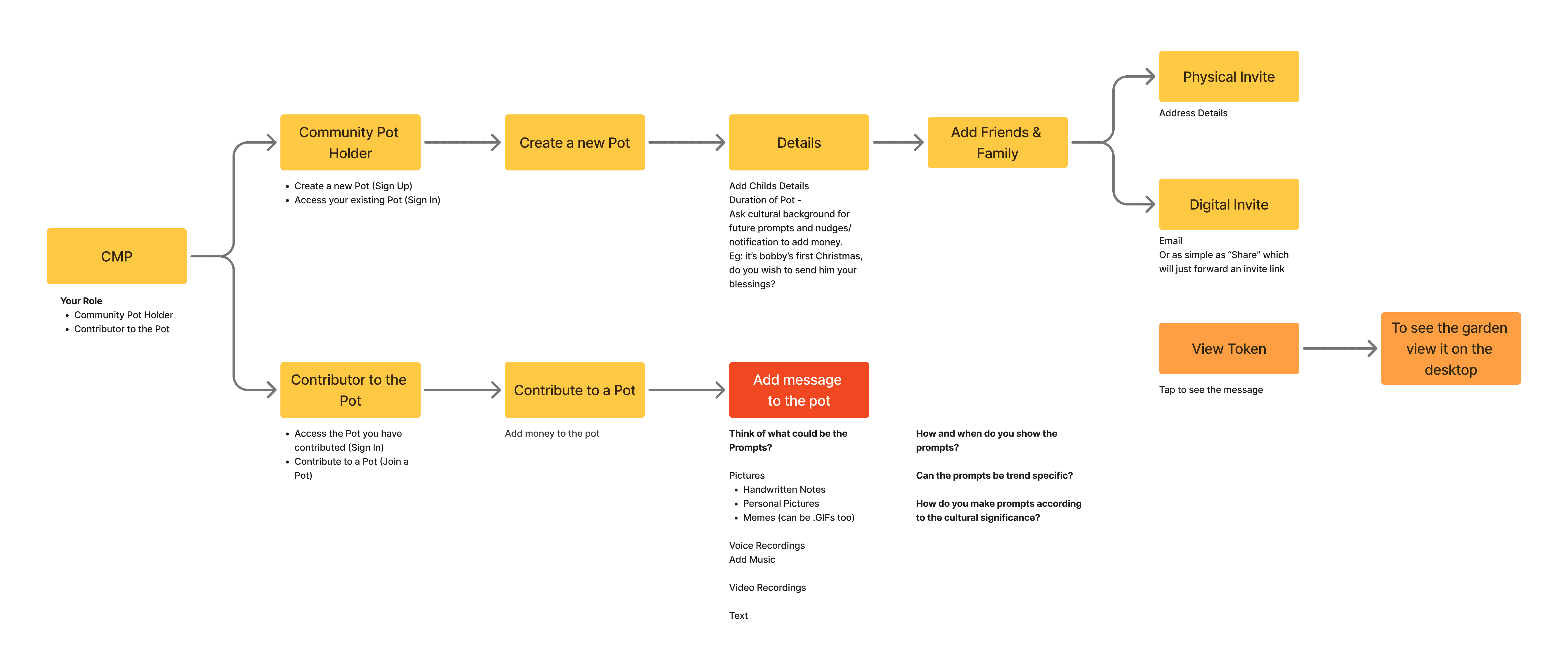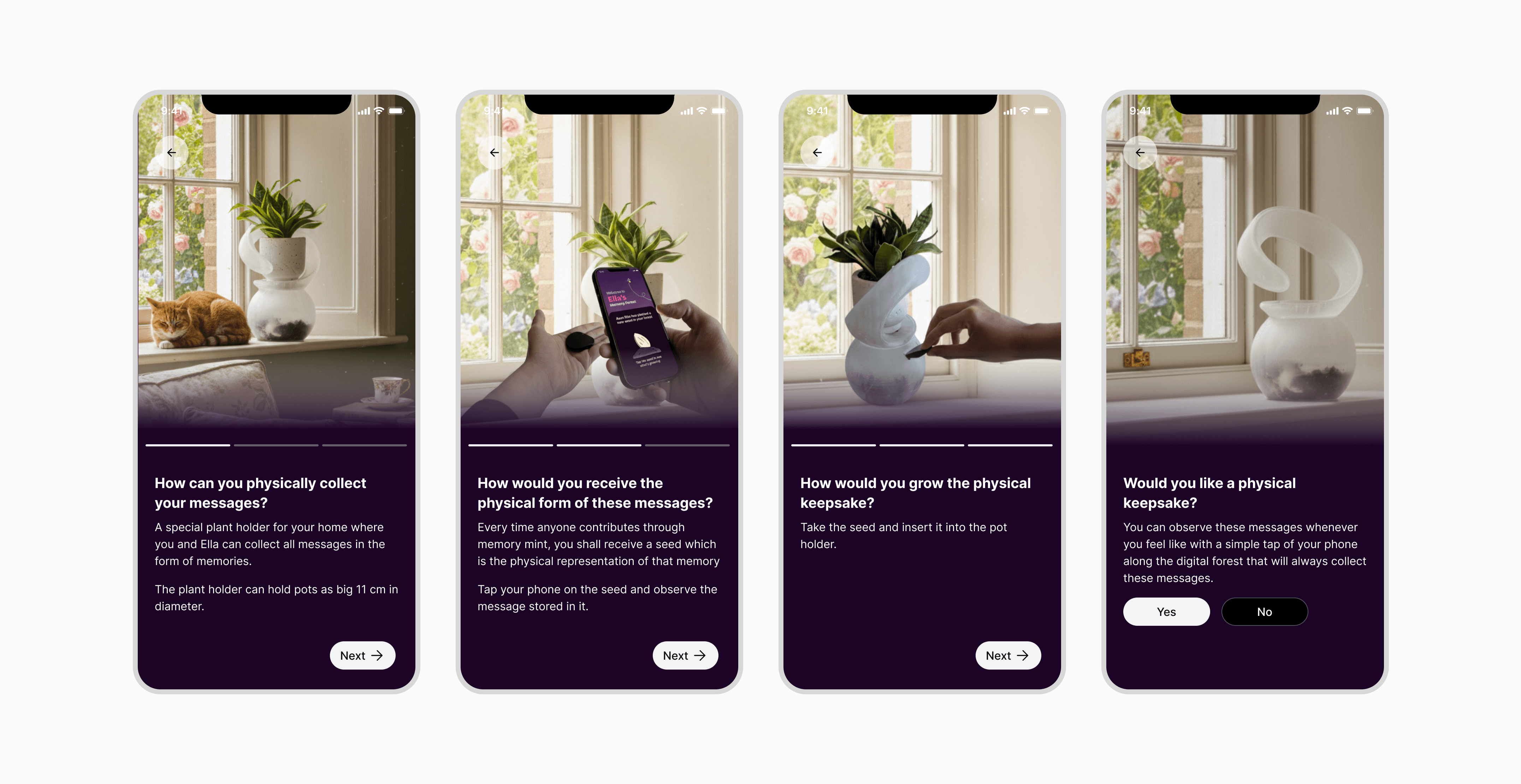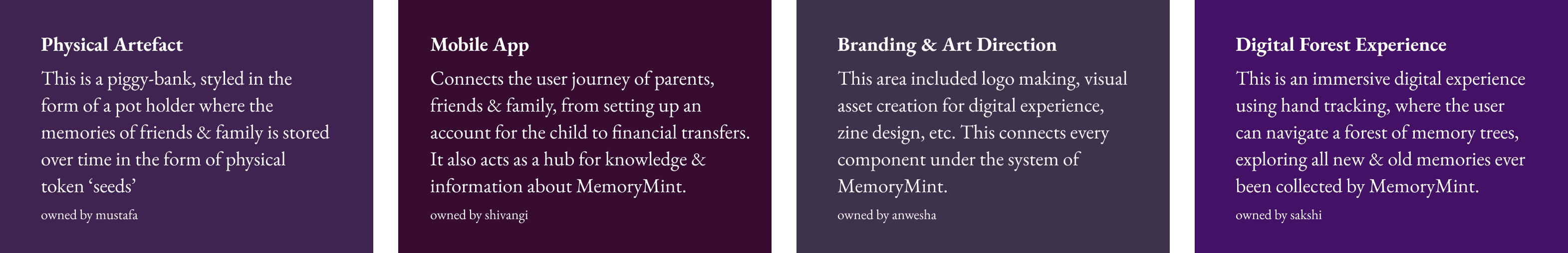 Broadly, there were 4 areas of work to be done to bring this very large system to life. Even though our main focus was visualising the growing pot of memories in physical & digital format, building other aspects such as onboarding for gifters, mobile app user journey & branding for the entire service was very important for us to be able to communicate our idea during the final presentation & our postgrad exhibition.
