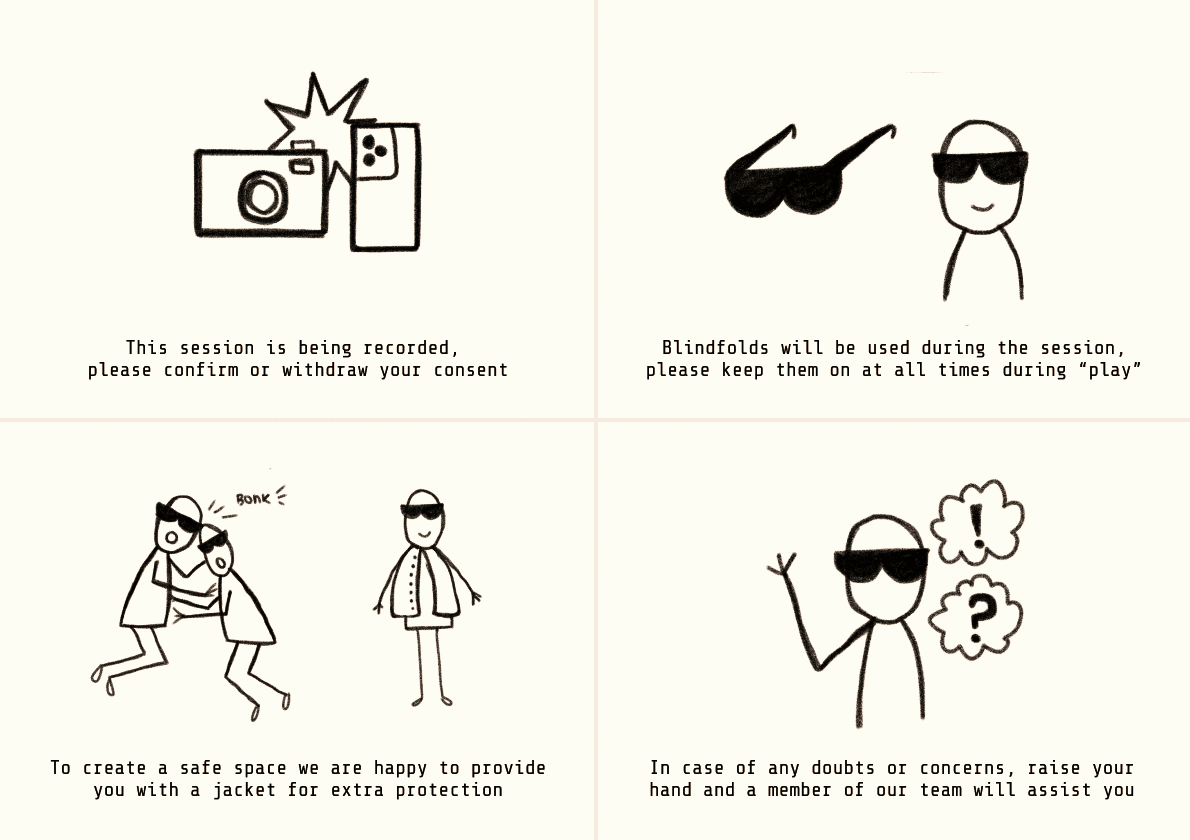Another test involved students unfamiliar with our LARP. One key insight was that participants feared being aggressively touched more than navigating difficult terrain. To address this, we introduced jackets for everyone, adding a protective layer and reducing discomfort while blindfolded.