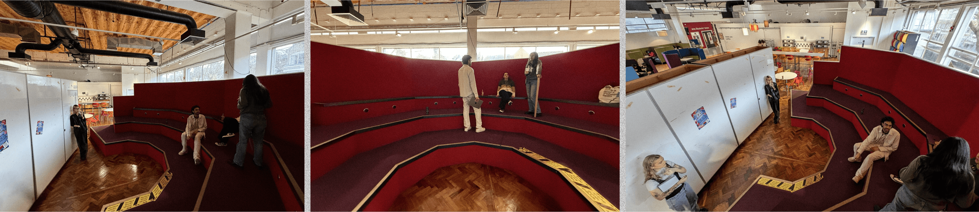 We planned to use a curtain to signal underwater vs. above-water moments, but safety concerns in our public location made this difficult. Ribbons as a makeshift curtain proved ineffective for blindfolded participants, so we abandoned the idea. We also designed a PA announcement for added immersion but had to discontinue it due to time constraints.