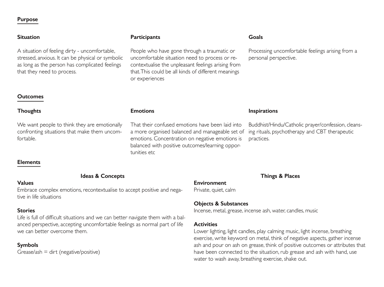 We designed a ritual to help participants confront and embrace feelings of being dirty. Individuals were asked to recall a memory or situation that made them feel dirty, write it down on a sheet of metal using grease, and reflect on how they could embrace it. They would then use ash to clean away the grease, symbolising acceptance of this state.