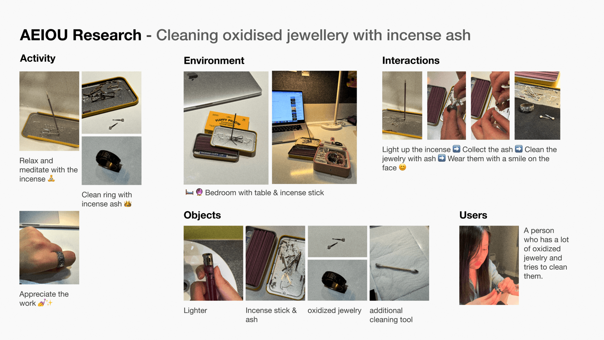 We explored the ceramics workshop at Camberwell College of Arts to examine the positive implications of dirt and visited a local dump to investigate its negative associations. Using the AEIOU research method, we systematically documented observations in both locations.