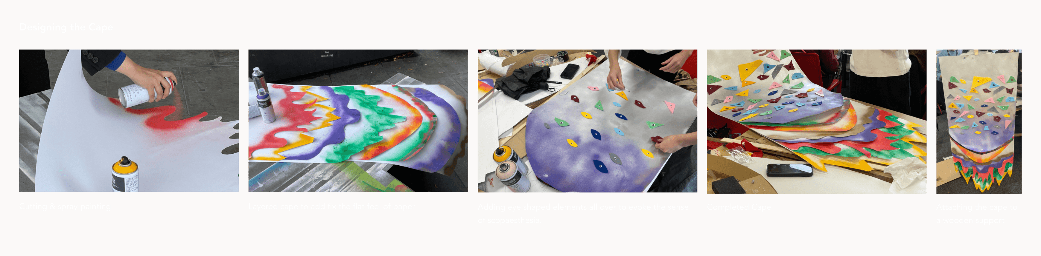 The exterior of the cape featured graffiti-edged layered papers with googly eyes, mirroring all the eyes looking in from the outside and empowering the wearer, as if the cape allowed them to stare back at the external gazes.