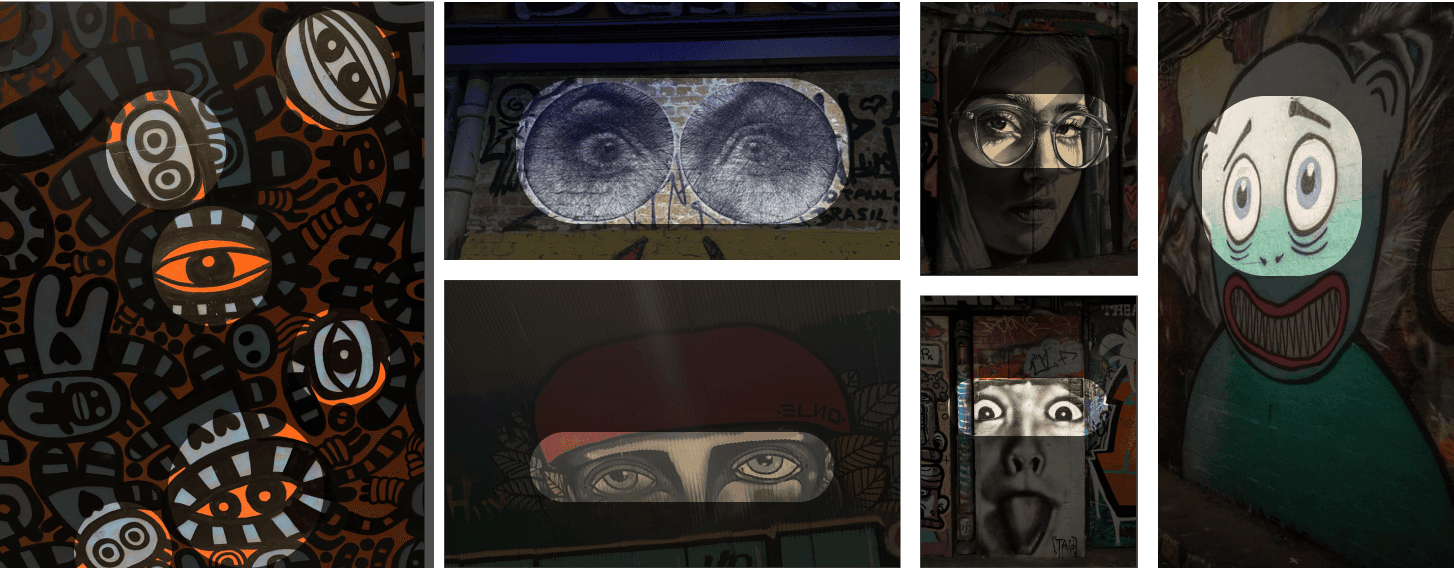 The strong smell of fresh paint engulfed us as we entered the tunnel. Walking through it multiple times, we observed the painters, their artwork, and every corner of the space. A recurring theme stood out in the paintings — many featured faces, some with realistic details and others with unsettling, creepy eyes. Disembodied eyes, repeated in patterns, were also common.