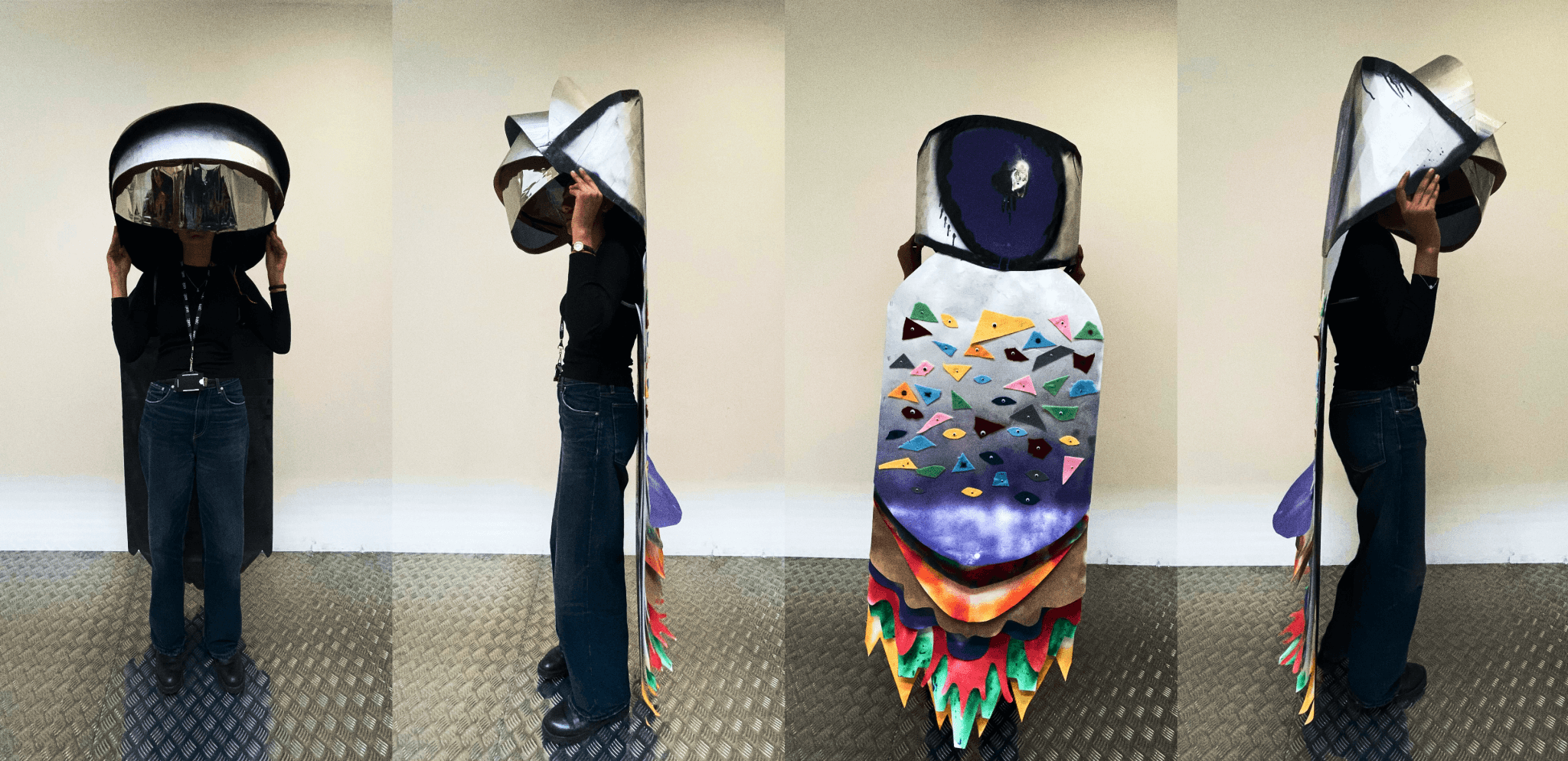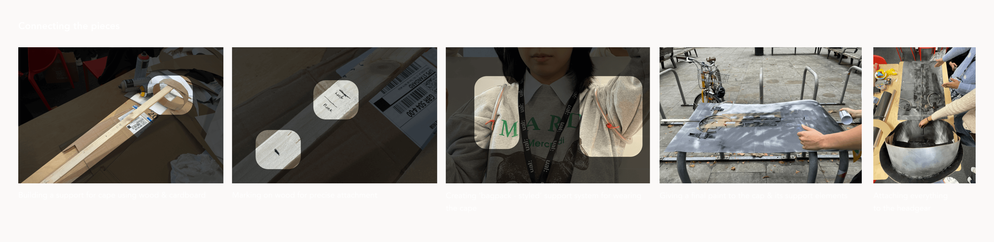 Our prototype had movable elements that could be adjusted for varying levels of anonymity. A cape was added to enhance the sense of protection and visually evoke the sense of scopaesthesia for anyone looking from the outside.