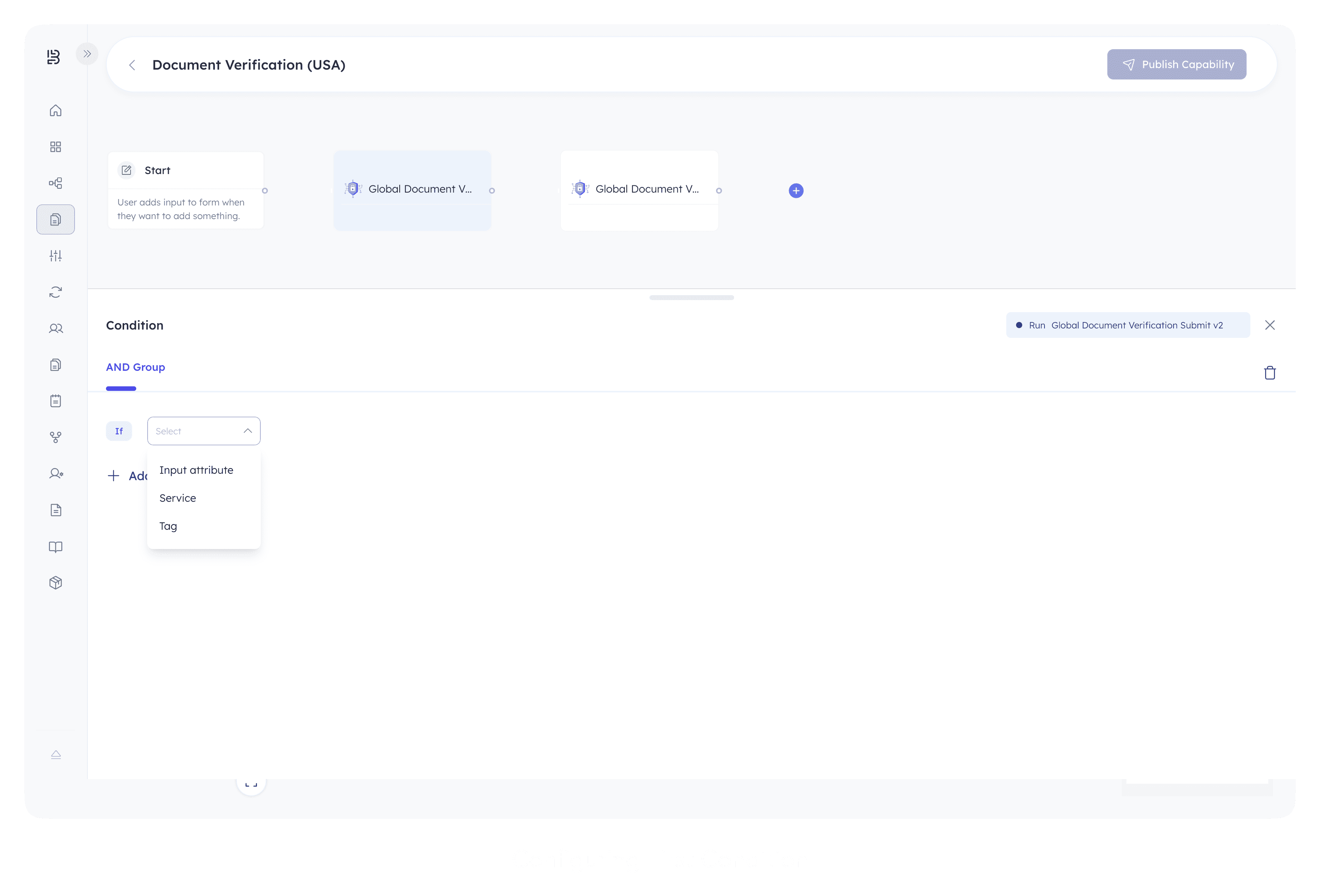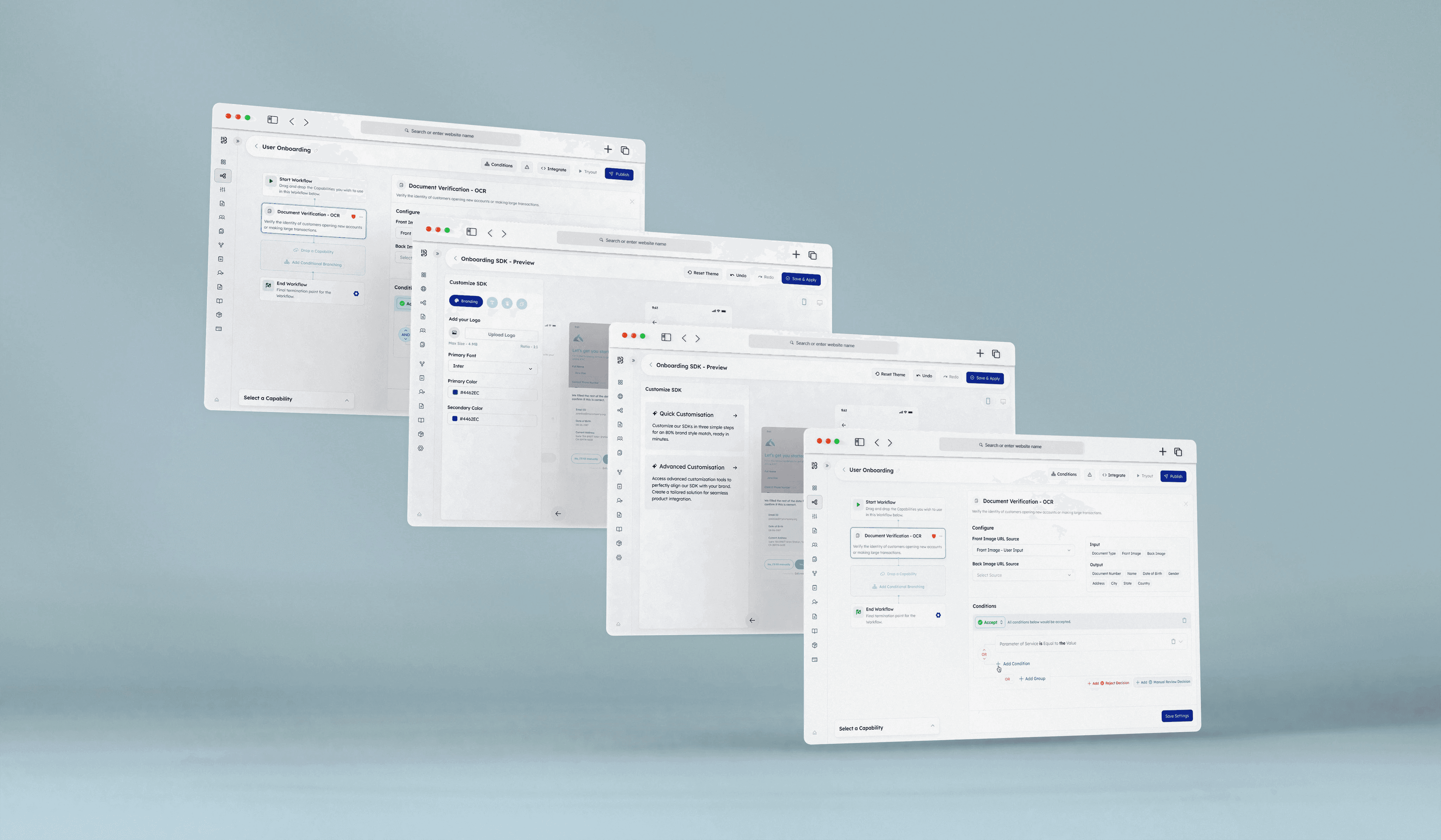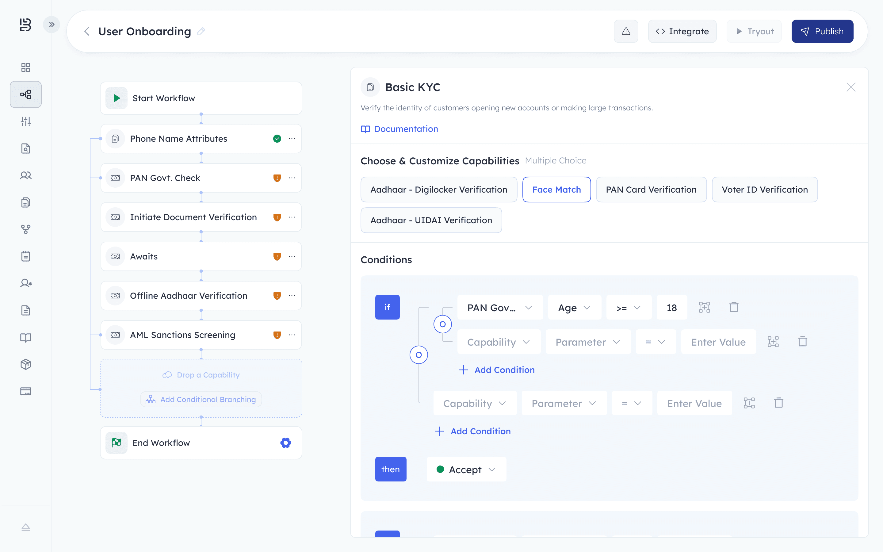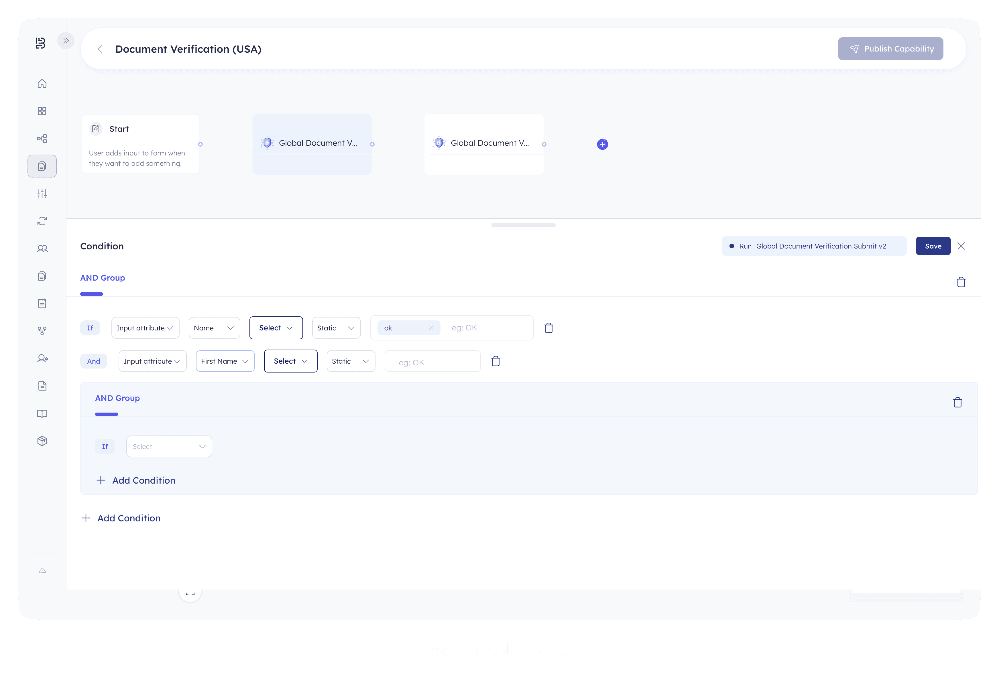 Workflows are made of smaller blocks called capabilities. These capabilities are responsible for running the checks on every dataset based on some conditions, and returning a decision, whether it’s accepted or rejected. Users can set up document check, selfie or liveness check, device intelligence checks and behavioural biometric checks to reduce the risk of fraud from new or existing customers.