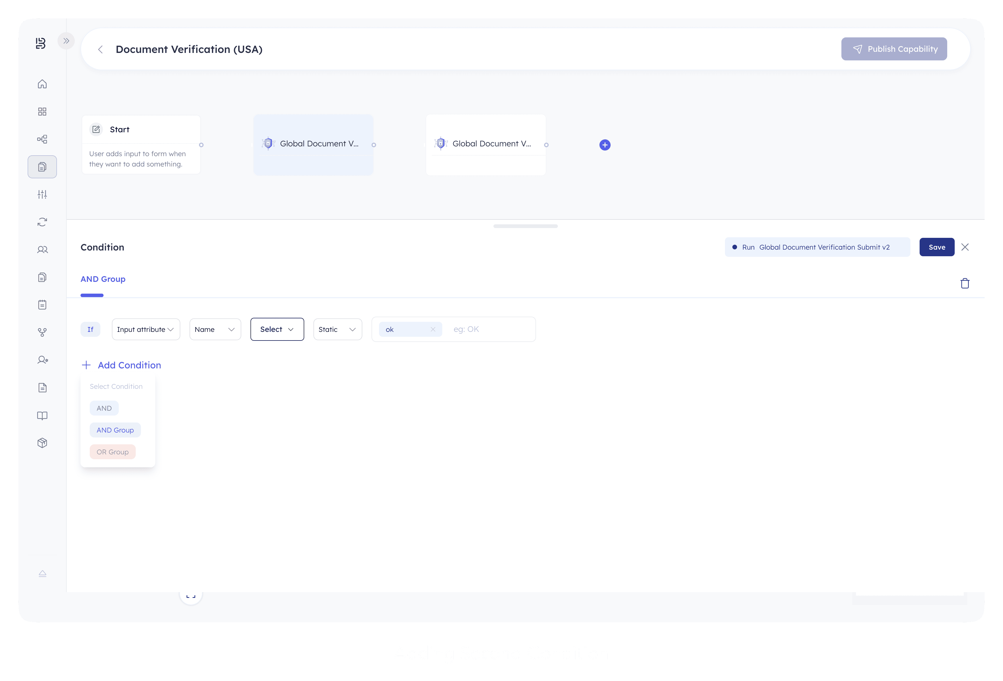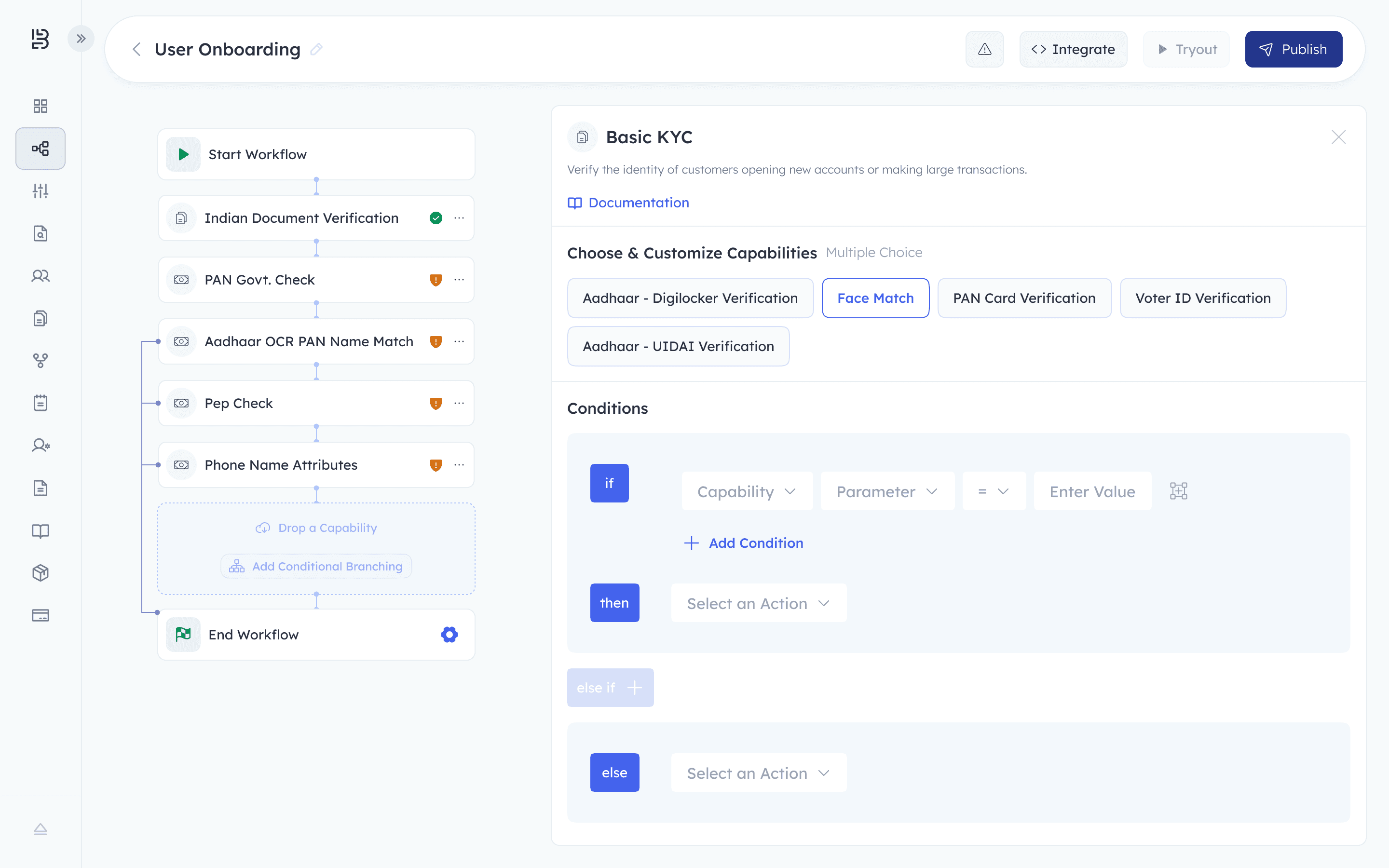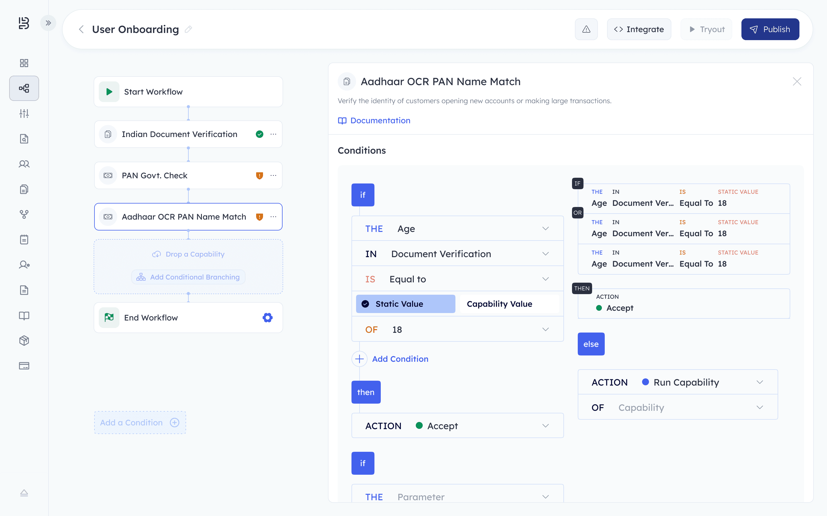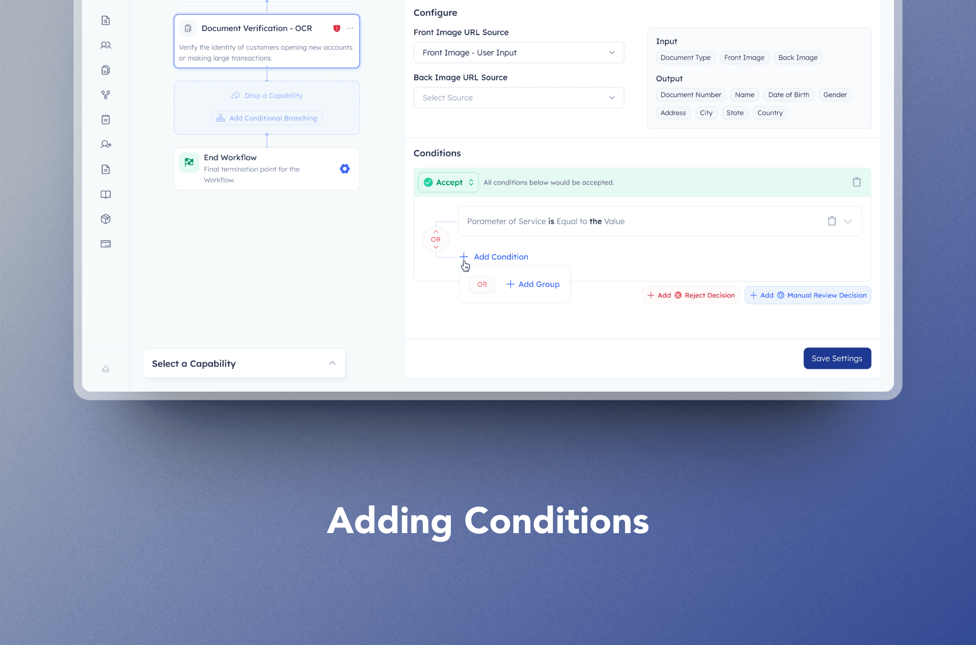 Workflows are made of smaller blocks called capabilities. These capabilities are responsible for running the checks on every dataset based on some conditions, and returning a decision, whether it’s accepted or rejected. Users can set up document check, selfie or liveness check, device intelligence checks and behavioural biometric checks to reduce the risk of fraud from new or existing customers.