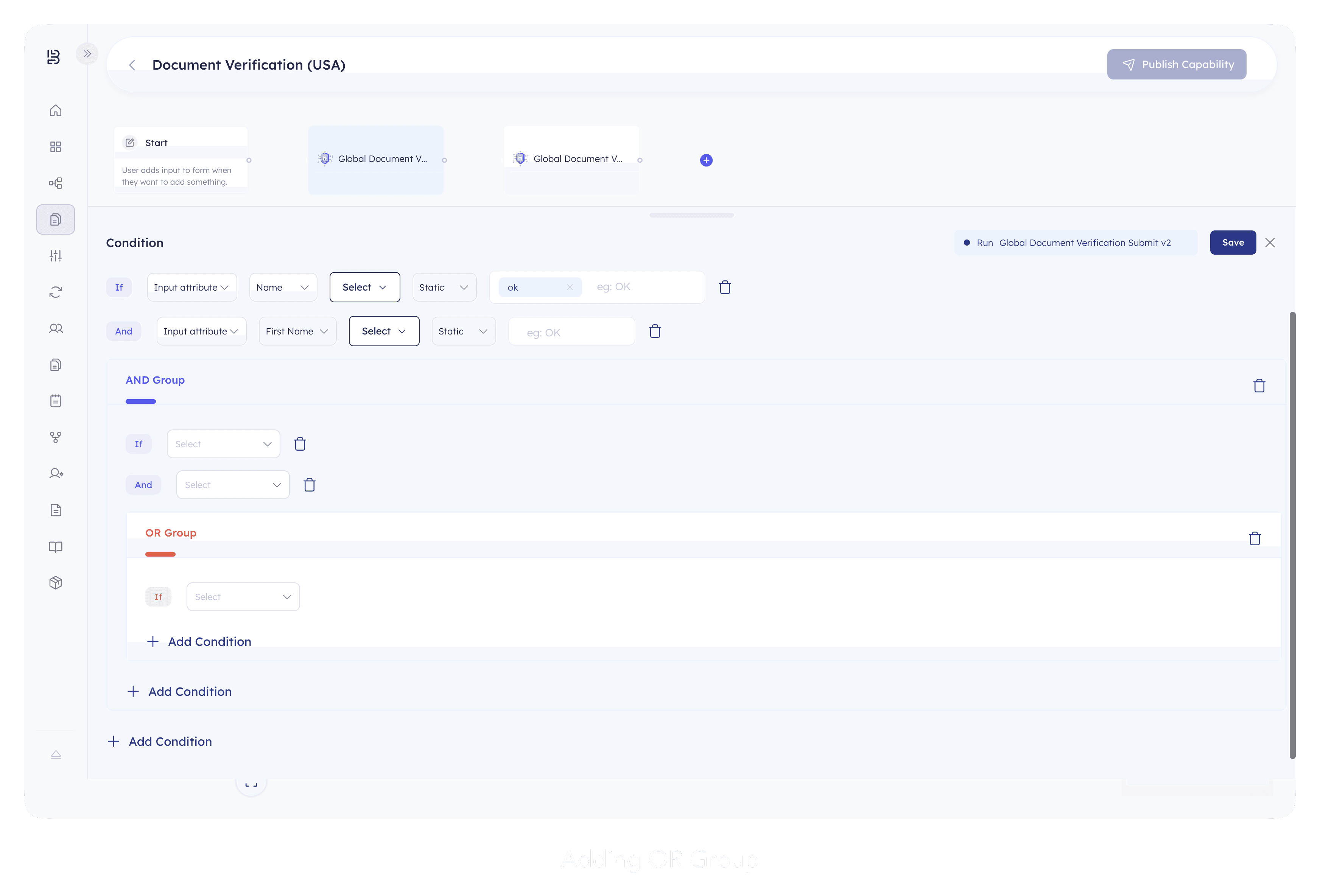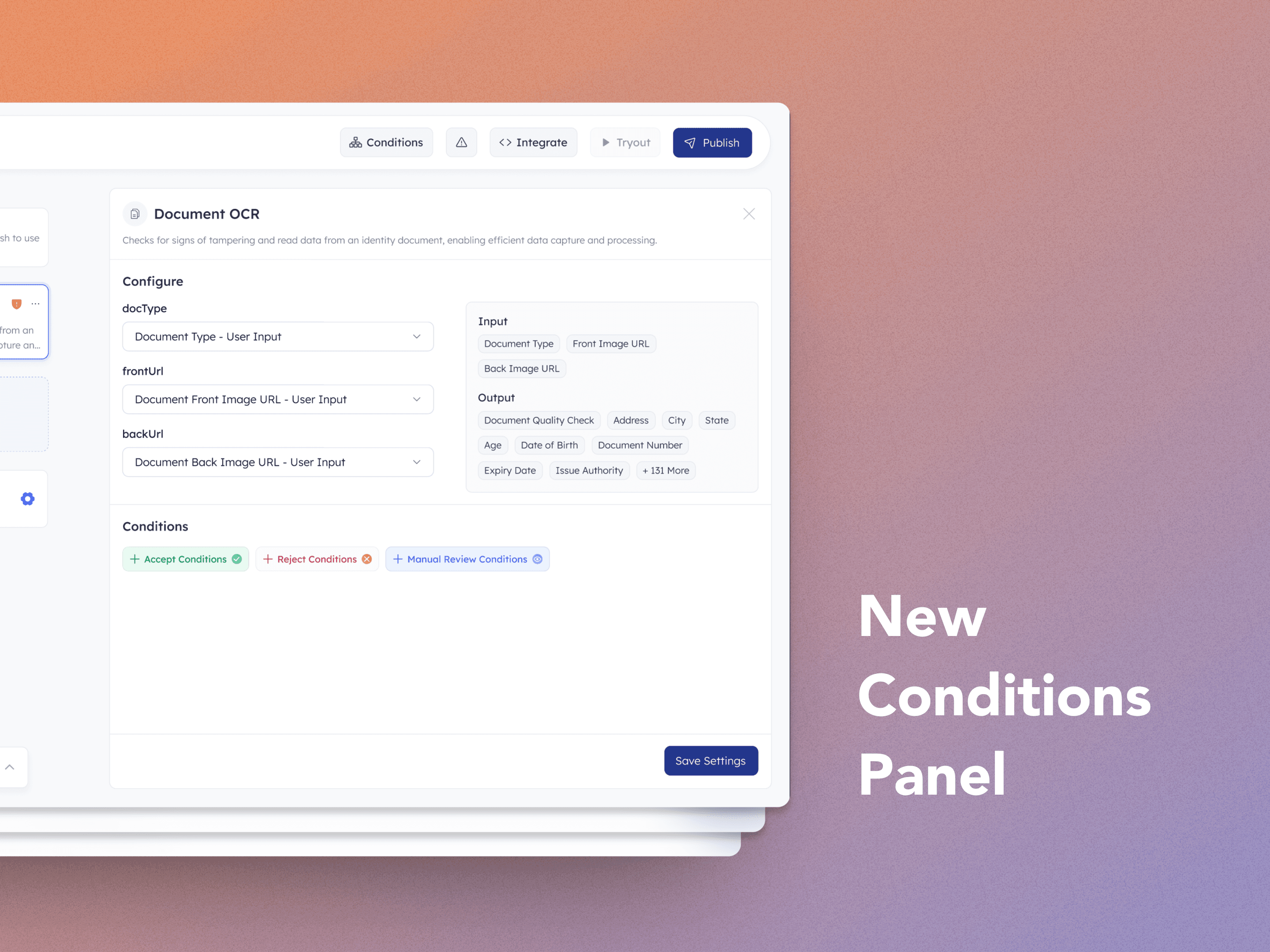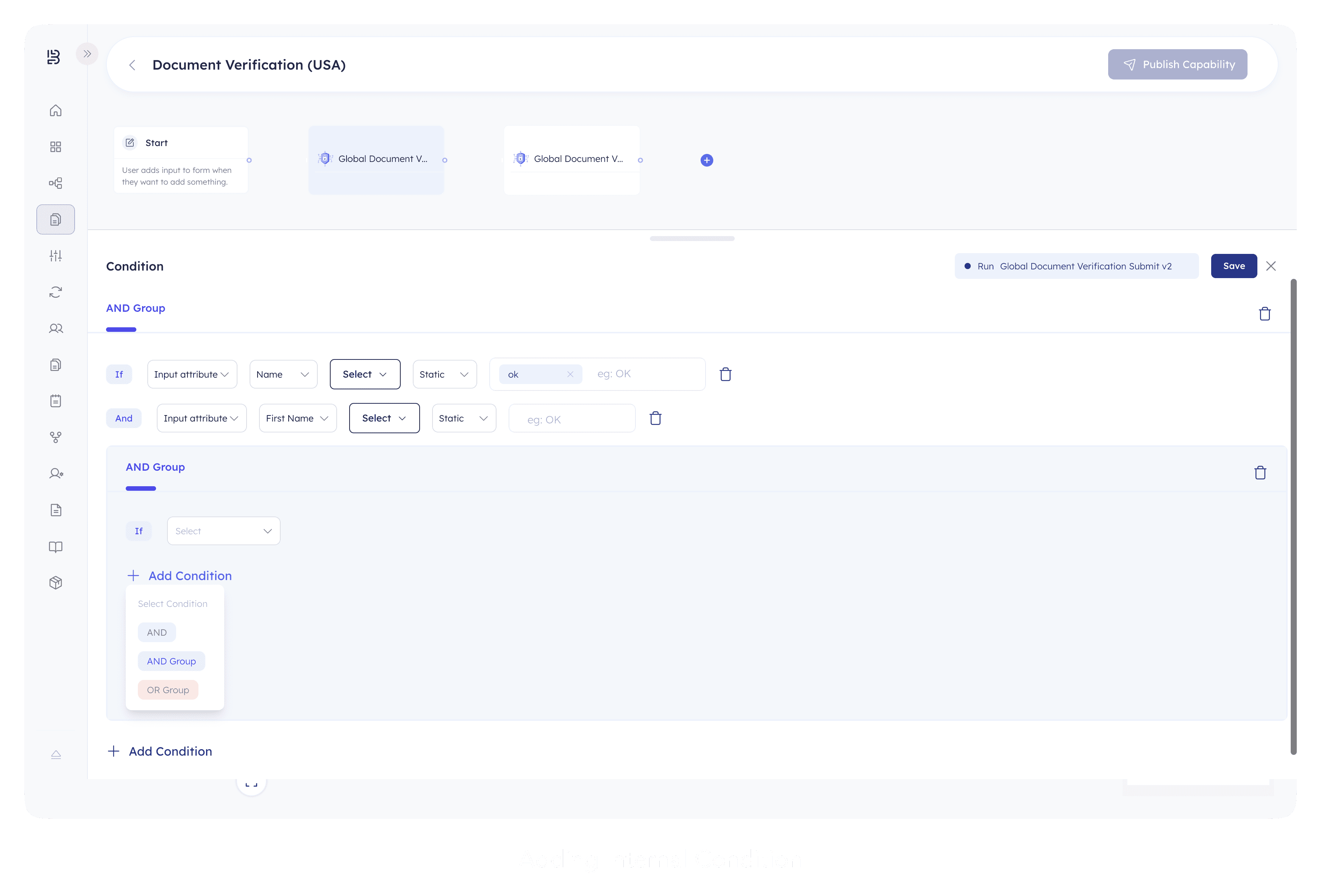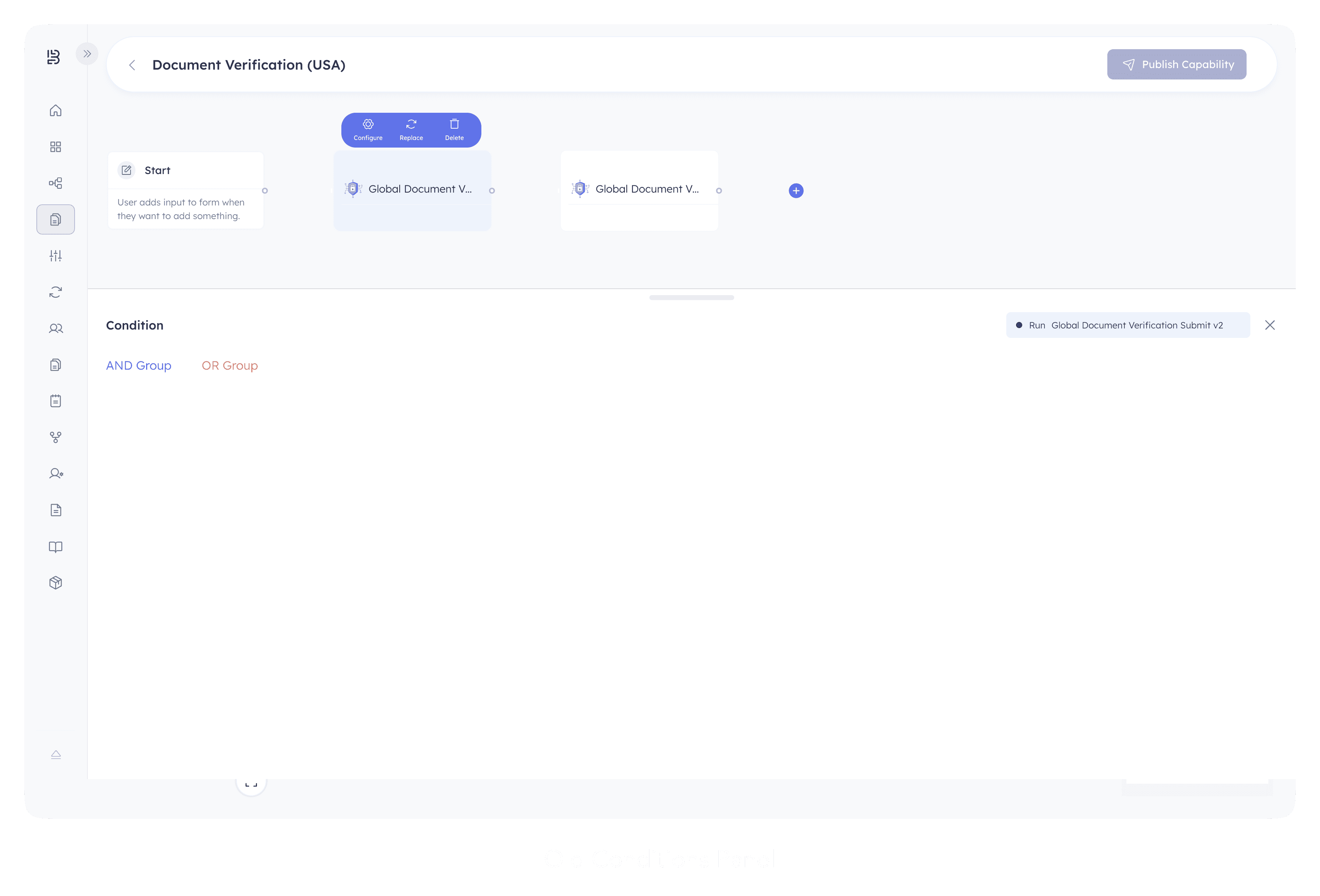 Workflows are made of smaller blocks called capabilities. These capabilities are responsible for running the checks on every dataset based on some conditions, and returning a decision, whether it’s accepted or rejected. Users can set up document check, selfie or liveness check, device intelligence checks and behavioural biometric checks to reduce the risk of fraud from new or existing customers.